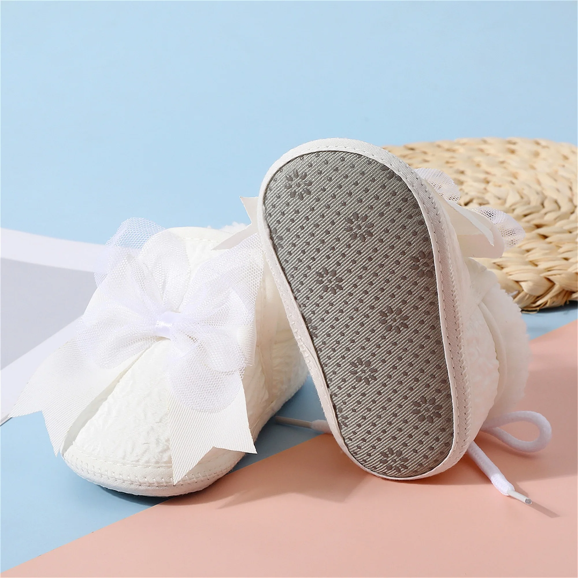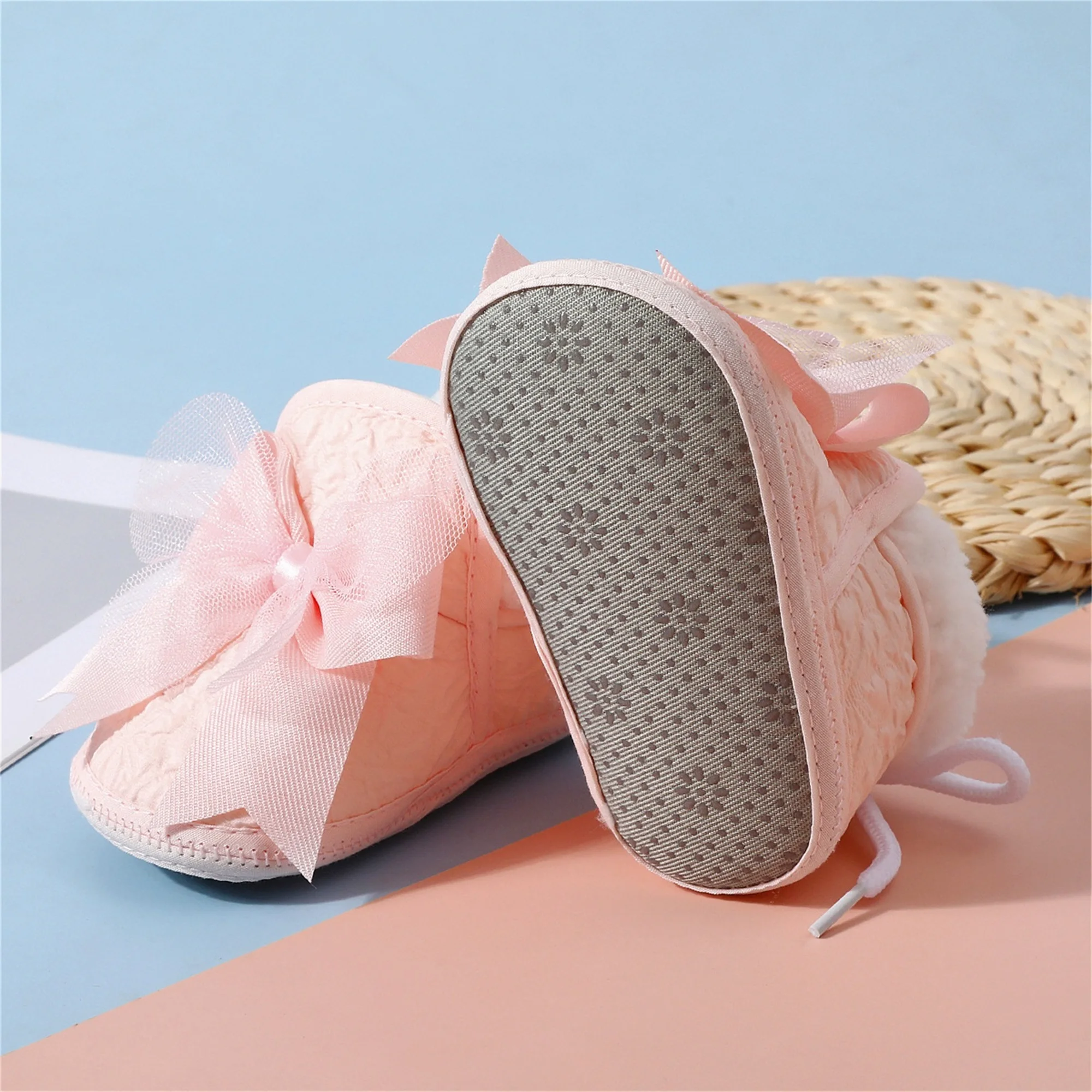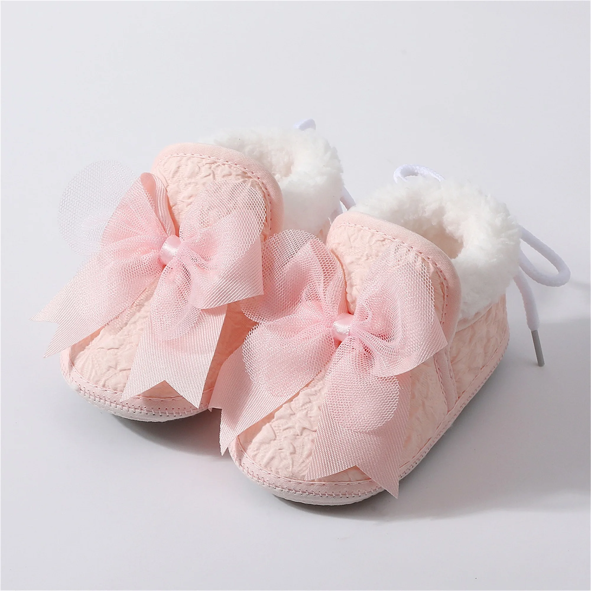 Baby Girl Bow Winter Shoes with Grip Cute Plush Lining Tie Up Soft Sole Non Slip Infant Walking Shoes